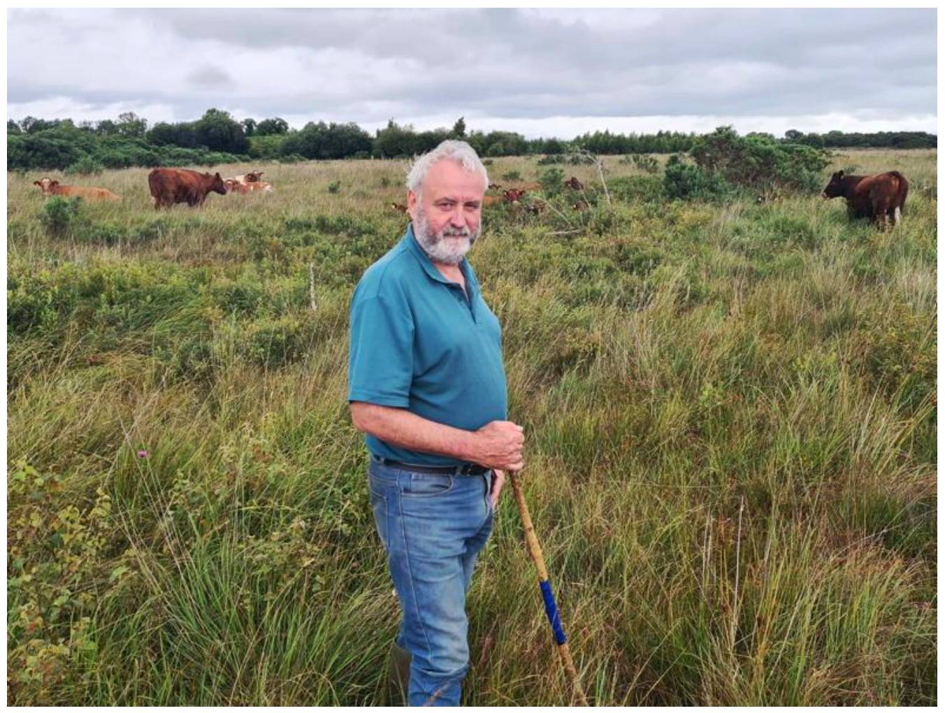 Noel Kiernan with his rare Irish cattle he has bred, the native forests he has planted, the pastures he has tended in an integrated way adjacent to peatland areas of Lough Ree, Ireland. Noel and others have been rewilding for decades. Photo: Irish Farmers Journal.