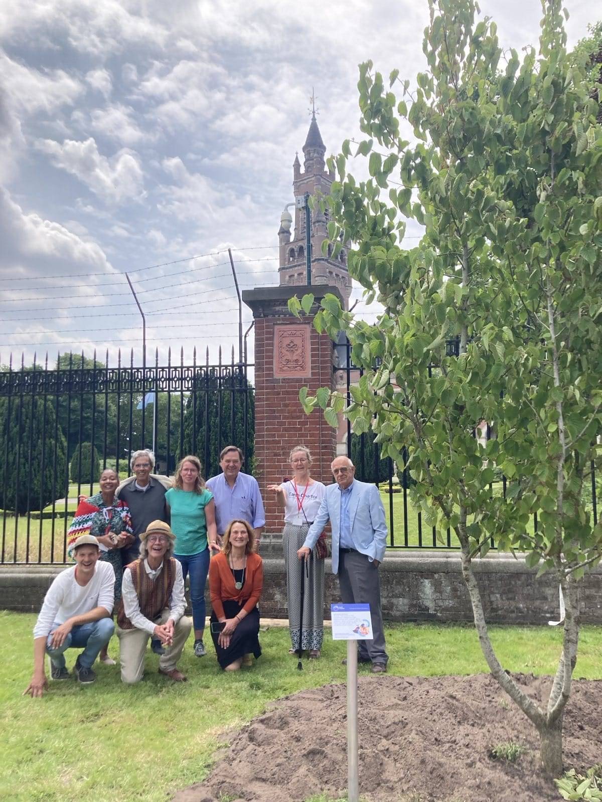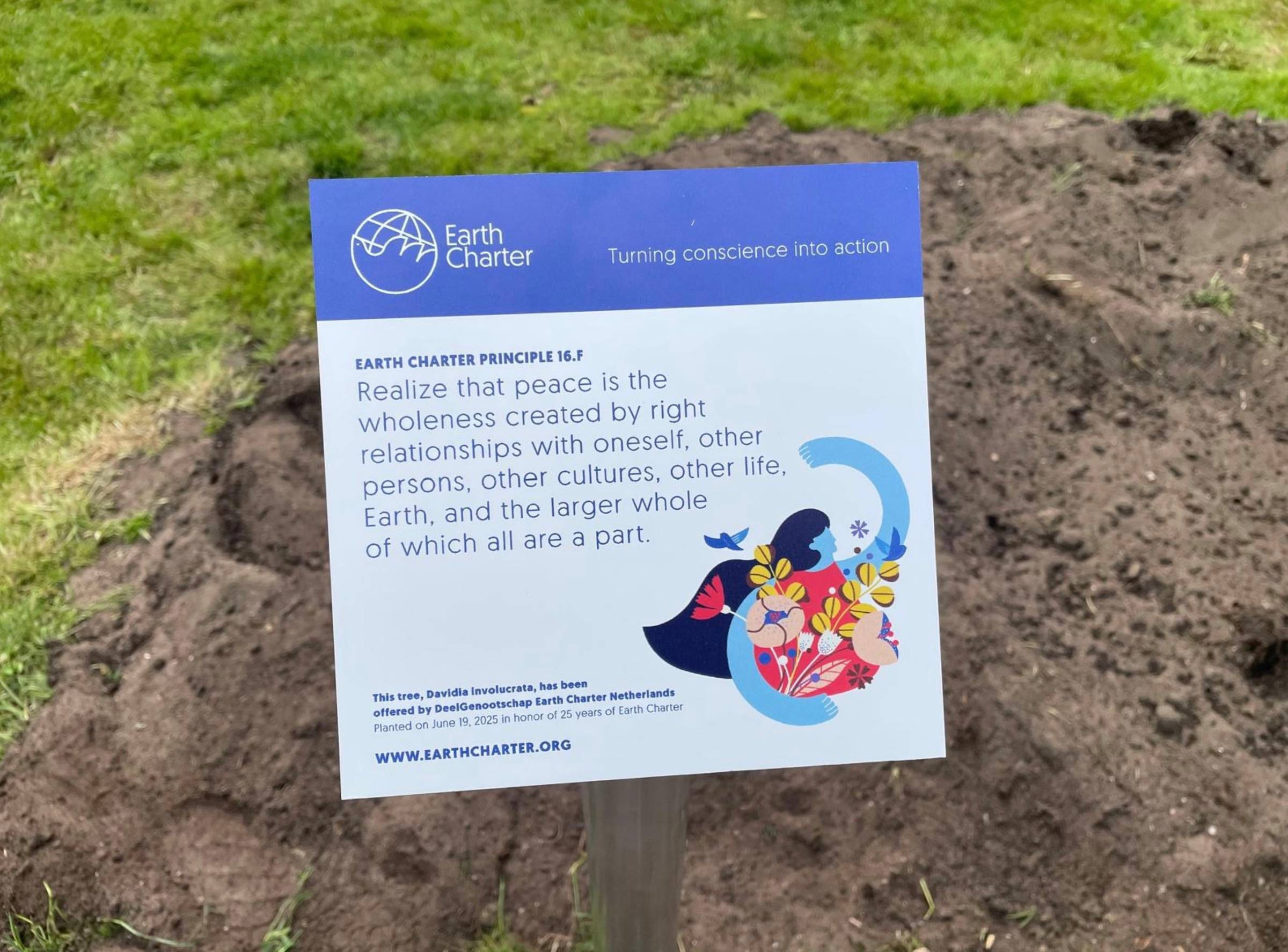 .Thursday last week, 19 June 2025, members of the Earth Charter community in The Netherlands gathered at the Peace Palace in The Hague to plant a special tree, in honour of 25 Years Earth Charter. It is a "Davidia Involucrata" which symbolises peace and hope - because of its special white flowers in springtime and its green leaves in the form of a heart. The tree was welcomed with a special ceremony created by the planters