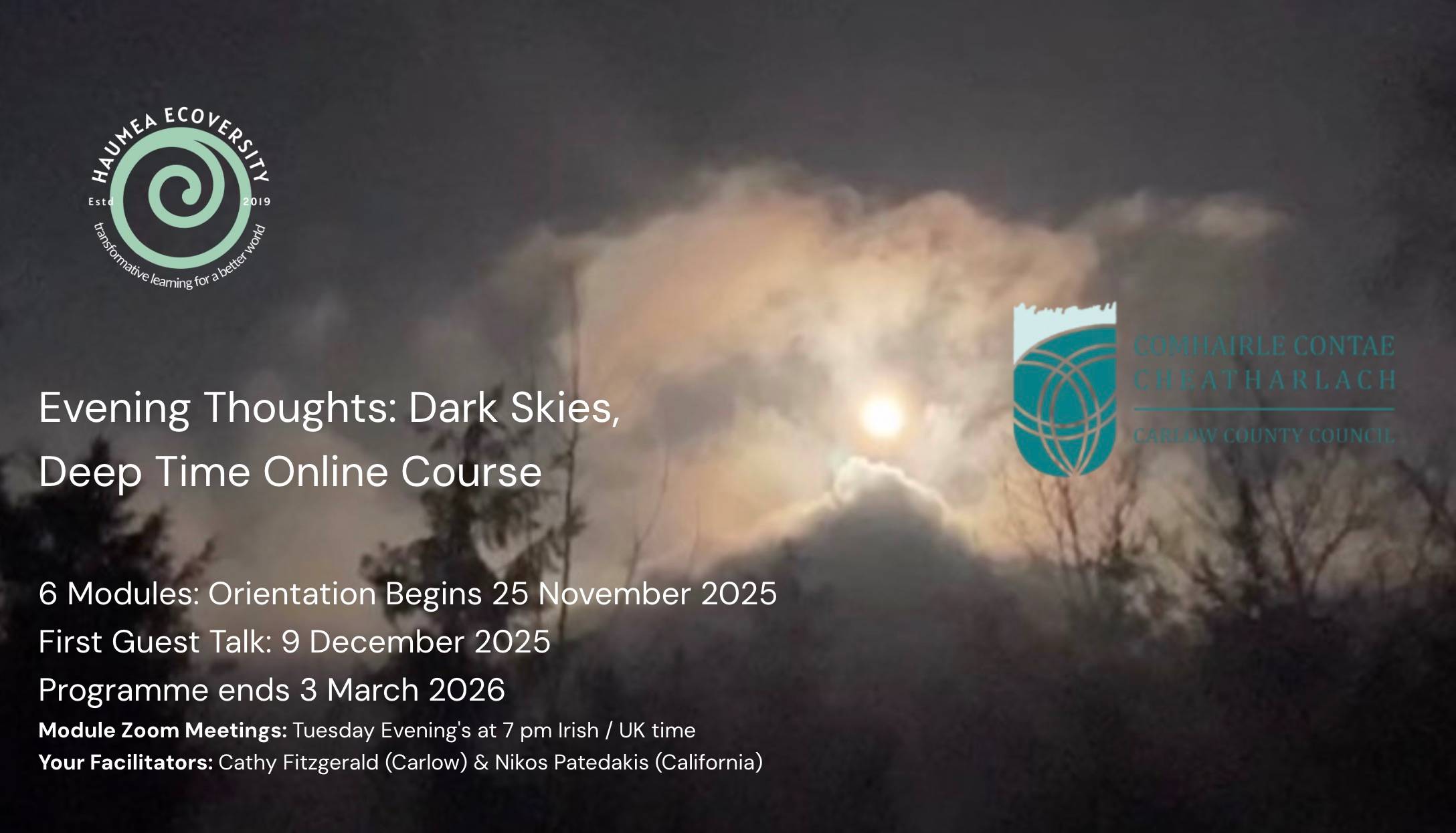 Dear reader, I want to share a course that has been growing quietly in my work for some time. It comes from my work for the community-led peatland restoration work for the Drummin Bog Project in South County Carlow. It comes from my concern about falling levels of nature connection in Ireland. It also comes from my gratitude for the ecological thinker Thomas Berry, whose work continues to guide so many of us (even though you may be unfamiliar with his name).. Here is what shaped this course. 🌿 Drummin Bog ⭐ Dark skies 📖 New stories to The Universe Story All of this has led to a new stand-alone Haumea Ecoversity course. I am delighted to share it with you. 🌙 New Evening Thoughts: Dark Skies, Deep TimeA very special six-module online course from Haumea Ecoversity Ireland now ranks among the lowest countries in the world for nature connection. Scientists keep warning that our current way of living is harming the conditions that support life on Earth. This course offers transformative guidance and practical ideas to help people notice nature with fresh eyes, deepen their sense of place, and reconnect with the wider community of life, whilst cherishing the wisdom of our ancestors and care for future generations. 🌱 Who this course is for• People interested in nature connection and wellbeing 📚 What the course includes• The Universe Story and an evolutionary view of life 🎤 Our guest speakers will be speaking on• Ireland -Dr Niamh Brennan — 'Why We Need a Universe Story' I will co-facilitate the course with my wonderful Haumea Ecoversity philosopher, DangerousWisdom.org podcaster colleague Nikos Patedakis (California). Can't make all the Zoom session dates? We will record the sessions and you will have access to the course platform for a year. Let's re-activate nature connection on scale, dear readers. ✨ Join usAll are welcome. (and please feel free to forward this notice) 👉 Details and booking: Places are limited. Early booking is helpful. PS __________________________________________ |